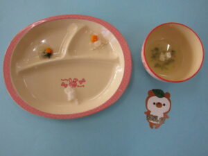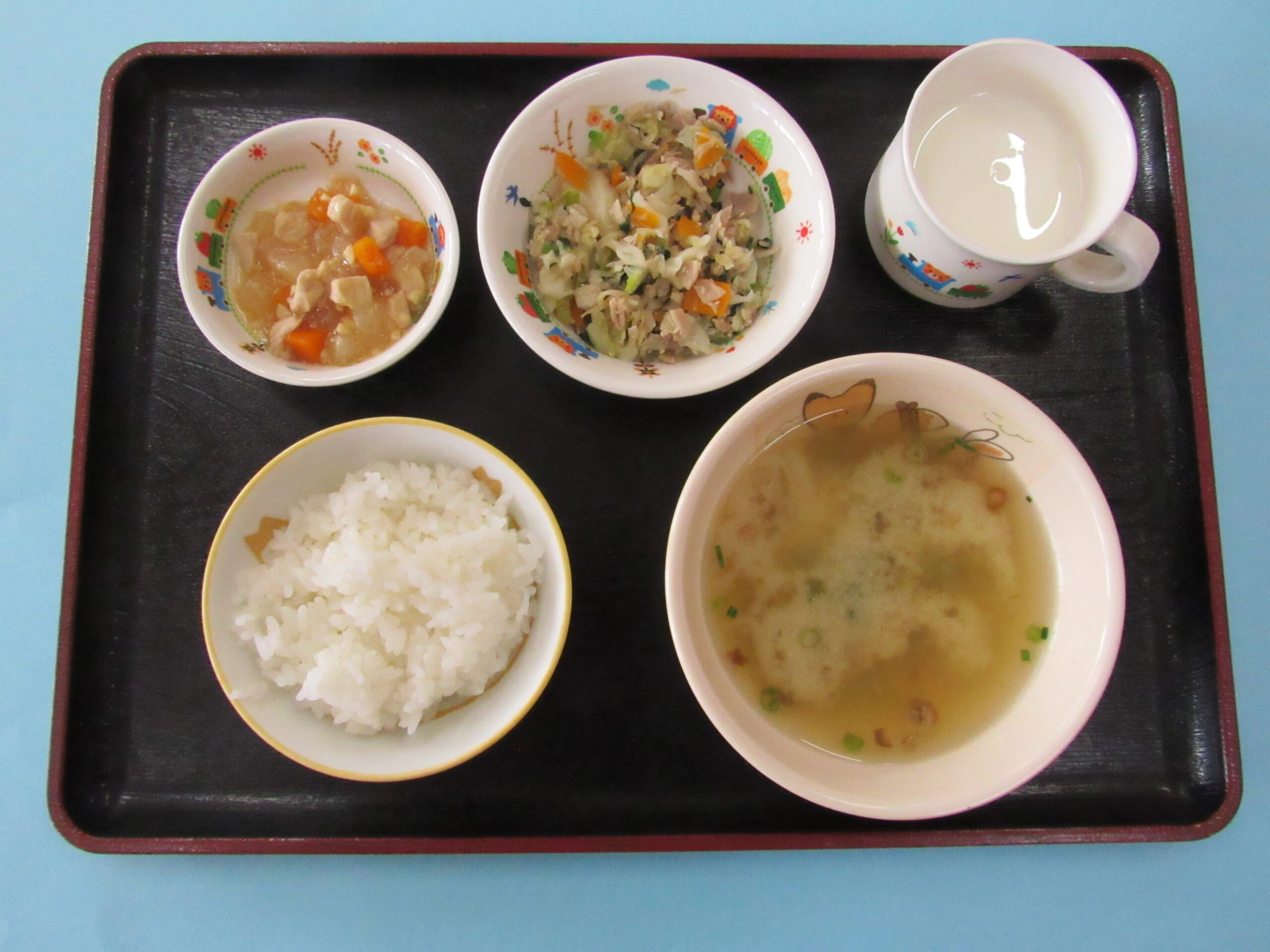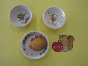 20250903 2025 9/03 ・ごはん ・豚肉のみそ炒め ・筑前煮 ・なめこのみそ汁 ・牛乳 <離乳食> ・軟飯(お粥) ・豚肉のみそ炒め ・筑前煮 ・豆腐のみそ汁 <おやつ> ・豆腐ドーナツ ・小魚 今日の給食