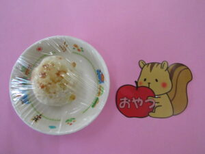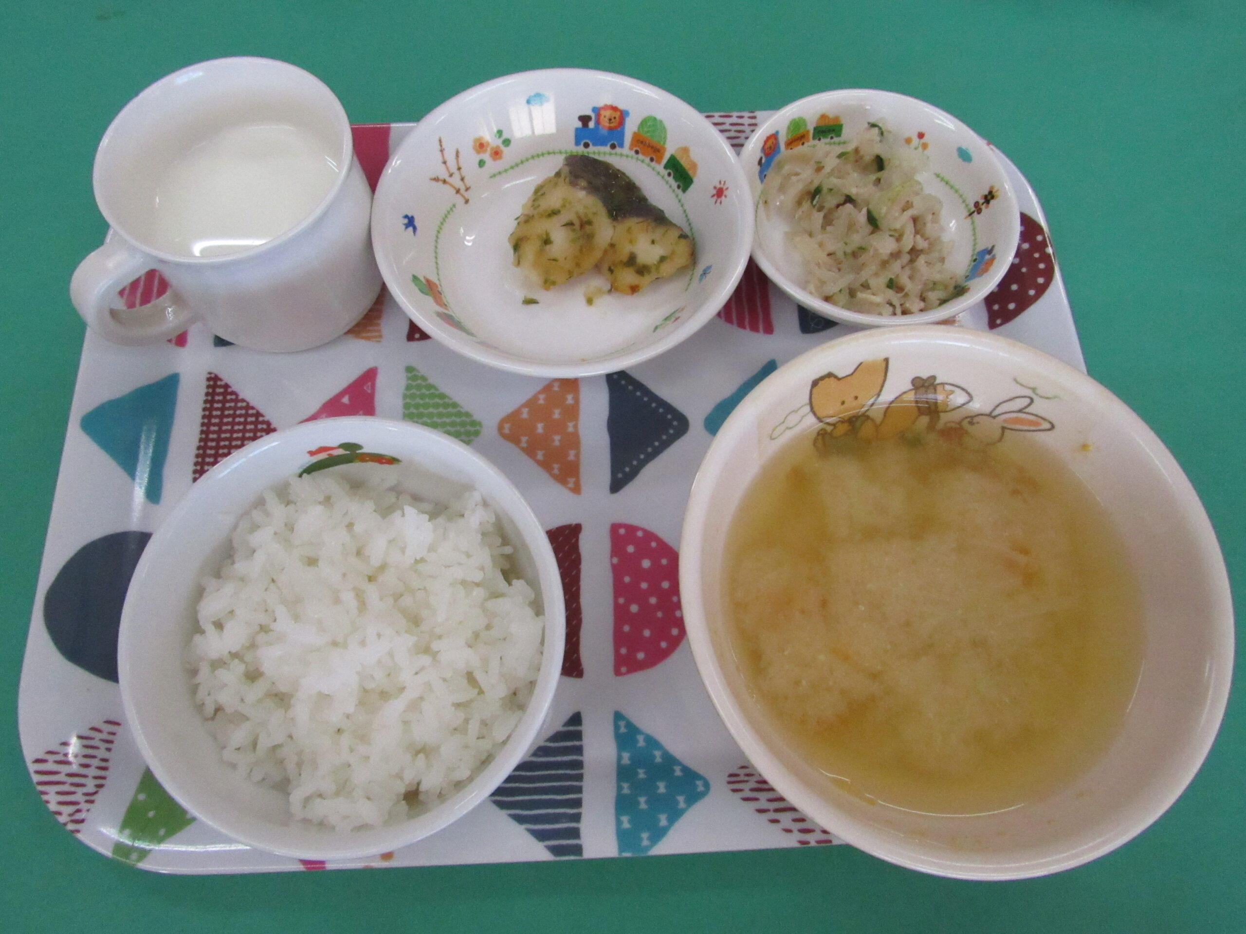 20250916 2025 9/16 ・ごはん ・白身魚のみそ焼き ・切り干し大根のバンバンジー ・里芋のみそ汁 ・牛乳 <離乳食> ・軟飯(お粥) ・白身魚のみそ煮 ・大根と胡瓜の酢の物 ・玉ねぎのみそ汁 <おやつ> ・ボンデケージョ 今日の給食