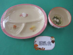 20250919 2025 9/19 ・麦ごはん ・鶏とじゃが芋のトマト煮 ・キャベツの梅おかか和え ・豆腐のすまし汁 ・牛乳 <離乳食> ・軟飯(お粥) ・鶏とじゃが芋のトマト煮 ・キャベツのおかかあえ ・豆腐のすまし汁 <おやつ> ・チュロス 今日の給食