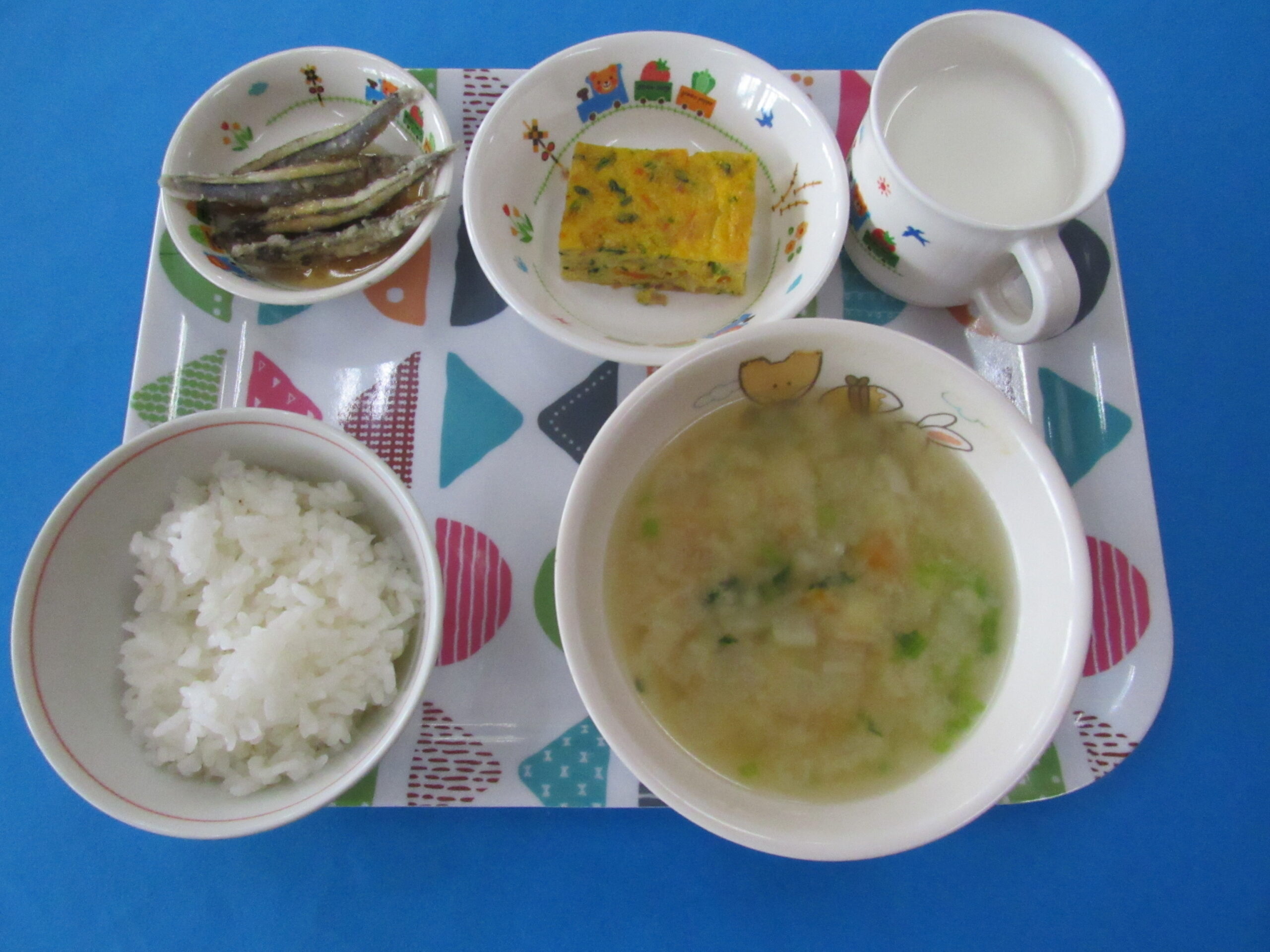 20250929 2025 9/29 ・ごはん ・きびなごのごまがらめ ・たまご焼き ・小松菜のみそ汁 ・牛乳 <離乳食> ・軟飯(お粥) ・煮魚 ・たまごやき ・えのきのみそ汁 <おやつ> ・豆腐ブラウニー 今日の給食