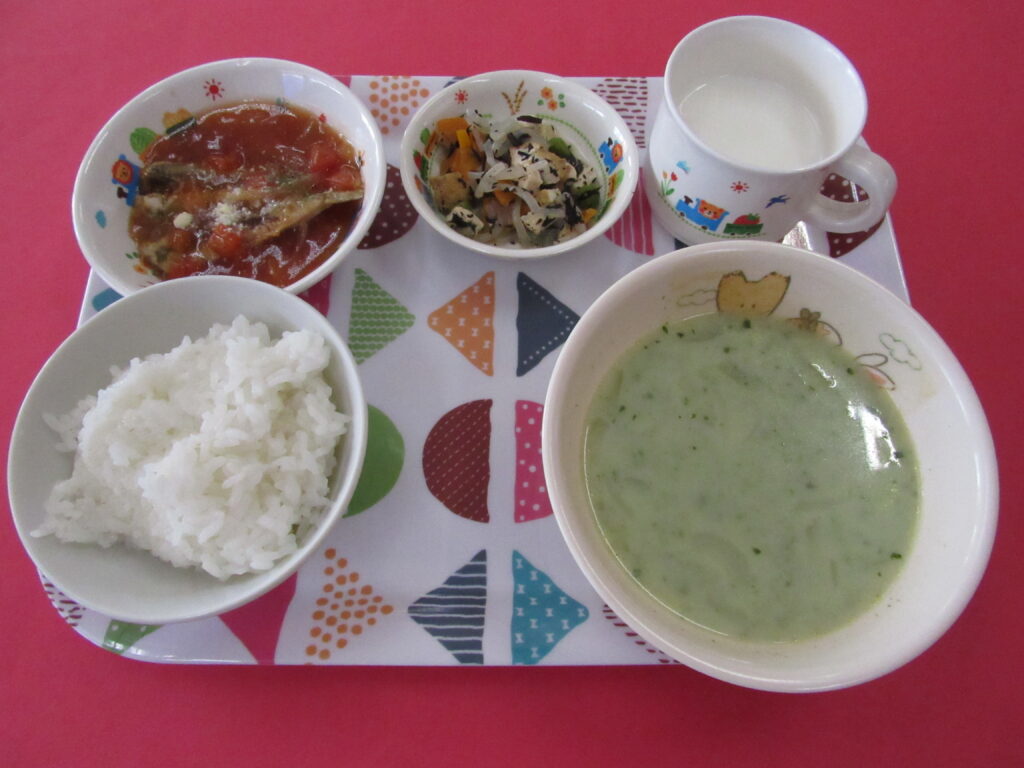 ・ごはん ・いわしのトマトチーズ煮 ・ひじき煮 ・ほうれん草のポタージュ ・牛乳 <離乳食> ・軟飯(お粥) ・白身魚のトマト煮 ・ひじき煮 ・ほうれん草のミルクスープ <おやつ> ・メープルバタートースト