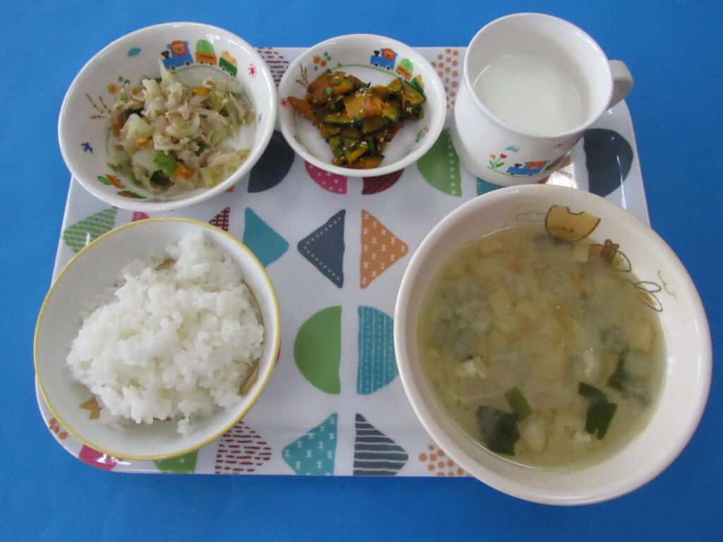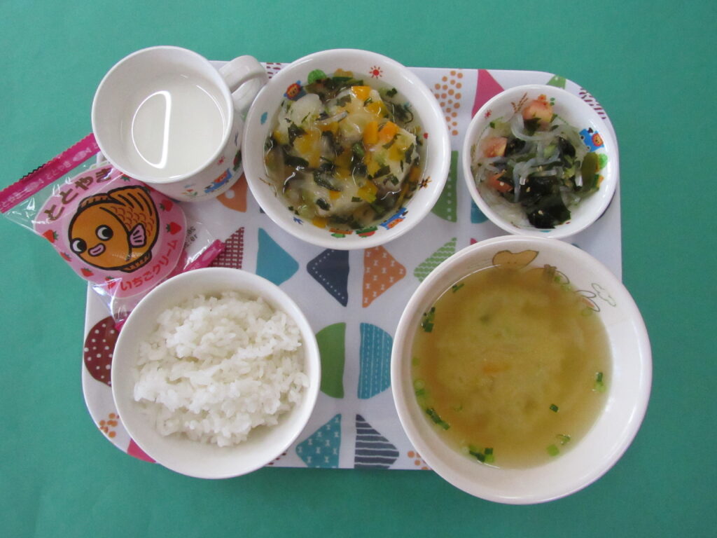 ・ごはん ・揚げ出し豆腐 ・わかめの酢の物 ・南瓜のみそ汁 ・デザート ・牛乳 <離乳食> ・軟飯(お粥) ・豆腐のあんかけ ・わかめの酢の物 ・南瓜のみそ汁 <おやつ> ・チーズピザ -