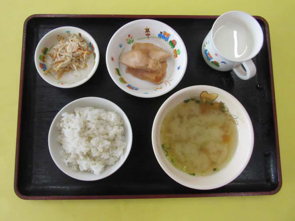 ・おにぎり ・肉みそうどん ・チキンのトマトガーリックかけ ・キャベツの甘酢和え ・牛乳 <離乳食> ・軟飯(お粥) ・鶏肉のトマト煮 ・キャベツのおかかあえ ・そうめん汁 <おやつ> ・南瓜のおやき ・小魚 -